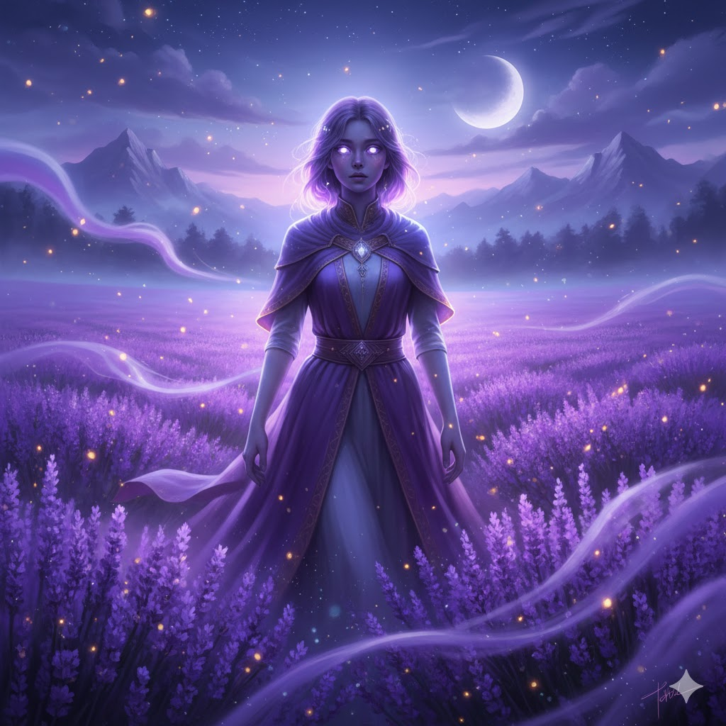 Create a cinematic night-time portrait in a lavender field under soft moonlight. Use deep purple tones, subtle glow, dreamy shadows, calm expression, cinematic night photography style, and a mysterious magical atmosphere.