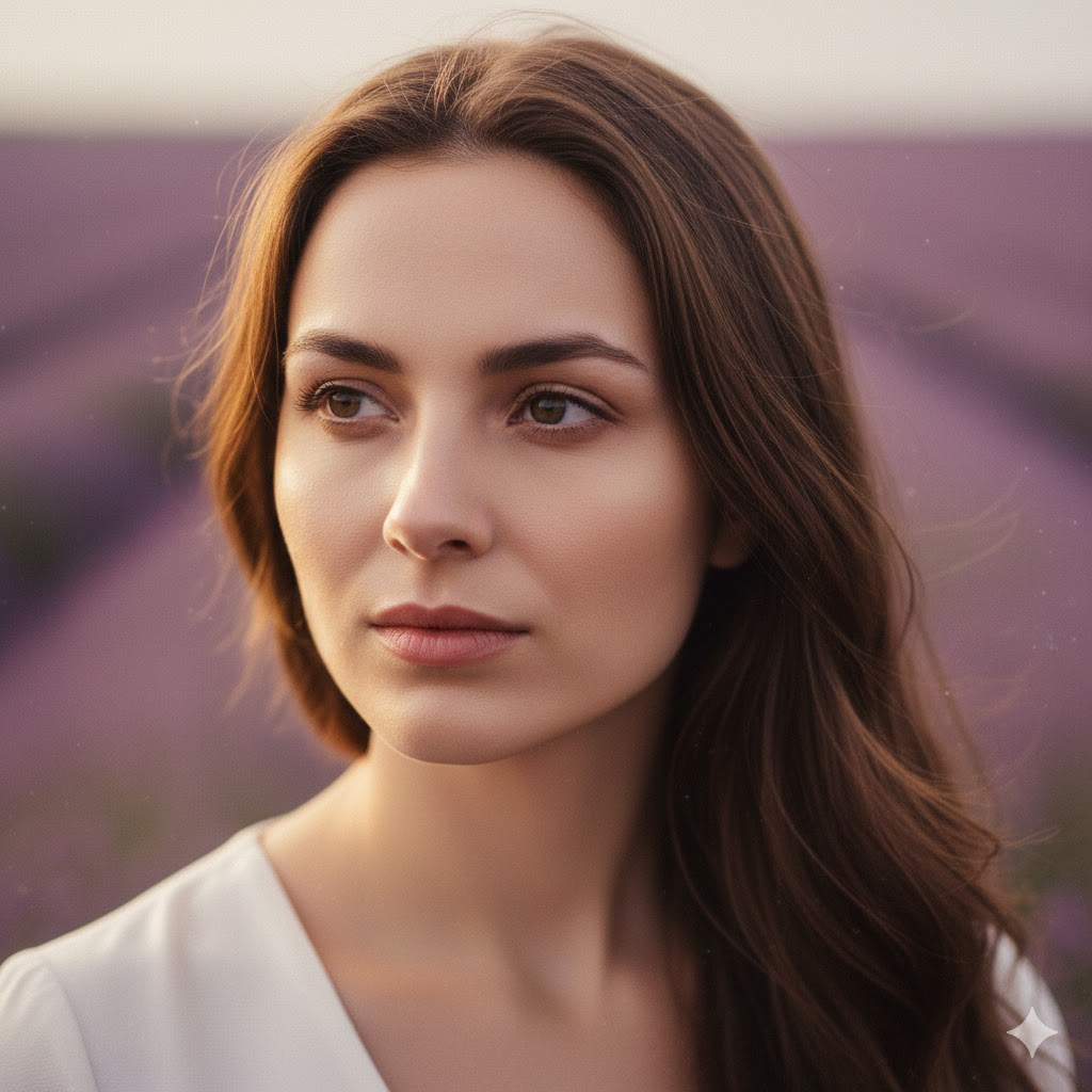 Create a clean and minimal cinematic portrait in a lavender field. Use simple composition, soft lavender background, natural skin tones, minimal color grading, modern aesthetic, cinematic softness, and balanced lighting.
