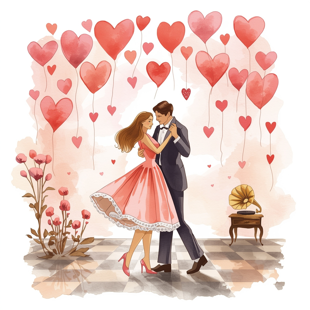 Create a whimsical watercolor illustration of a couple dancing in a vintage ballroom filled with floating heart-shaped balloons. The woman wears a flowing 1950s tea-length dress, and the man wears a classic suit. Include soft watercolor splashes in coral, blush pink, and lavender. Add vintage details like a gramophone, hanging paper hearts, and a reflective checkered floor. Loose, dreamy brushstroke style. Use aspect ratio 3:4.