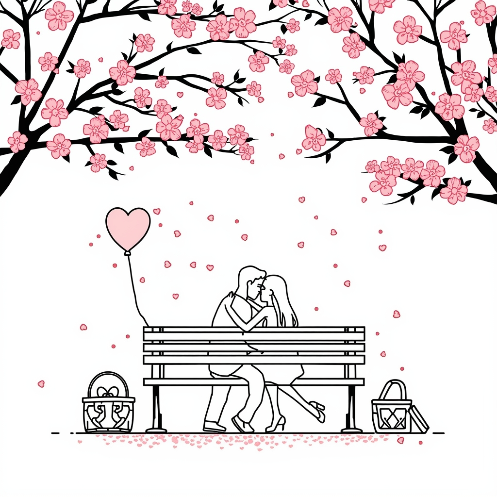 Create a modern minimalist single-line art illustration of a couple embracing on a park bench surrounded by blooming cherry blossom trees. Show the couple in profile with foreheads touching. Add falling petals, a heart-shaped balloon tied to the bench, and a picnic basket nearby. Use black line art with soft pink accents and subtle red highlights. Elegant and contemporary composition. Use aspect ratio 3:4.