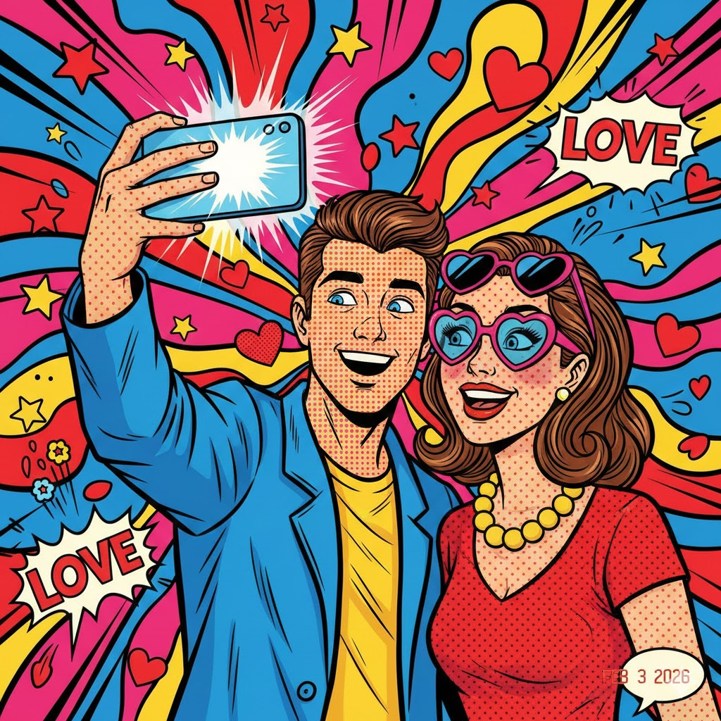 Create a vibrant pop art illustration of a young couple taking a selfie. Use bold outlines, halftone dots, and bright colors like hot pink, electric blue, yellow, and red. Surround them with comic-style hearts, stars, and “LOVE” text bubbles. Add heart-shaped sunglasses, Ben-Day dot textures, and action lines for energy and fun. Use aspect ratio 3:4.