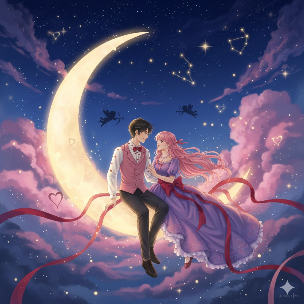 Create a dreamy digital painting of a couple sitting on a glowing crescent moon in a star-filled night sky with heart-shaped constellations. Render the couple in a soft anime-inspired style with Valentine-themed clothing details. Include pink and purple nebula clouds, cupid silhouettes, flowing ribbons, and sparkles. Warm golden moonlight. Use aspect ratio 3:4.