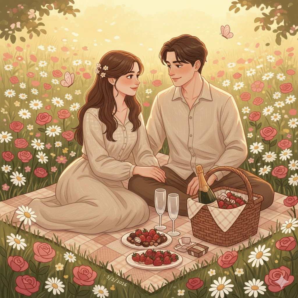 Create a cozy cottagecore illustration of a couple enjoying a romantic picnic in a flower-filled meadow. Include a wicker basket with strawberries, chocolates, and champagne. Surround them with daisies, wild roses, butterflies with heart-shaped wings, and soft afternoon sunlight. Warm, nostalgic textures with earthy tones and romantic pinks. Use aspect ratio 3:4.