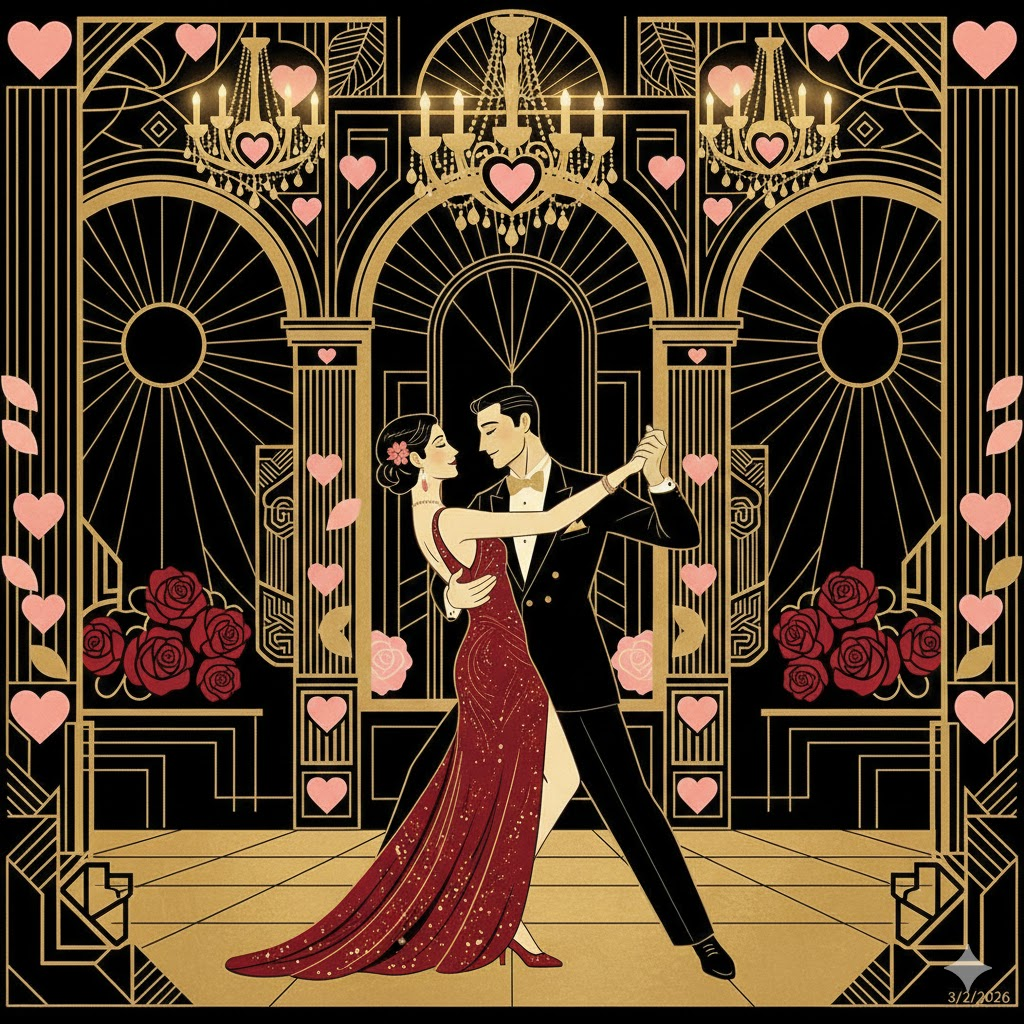 Create an Art Deco-style illustration of a glamorous couple dancing tango in a luxurious 1920s ballroom decorated for Valentine’s Day. Use bold geometric patterns, gold and black tones, and accents of deep red and pink. Include crystal chandeliers, heart motifs, and symmetrical designs. Elegant and luxurious feel. Use aspect ratio 3:4.