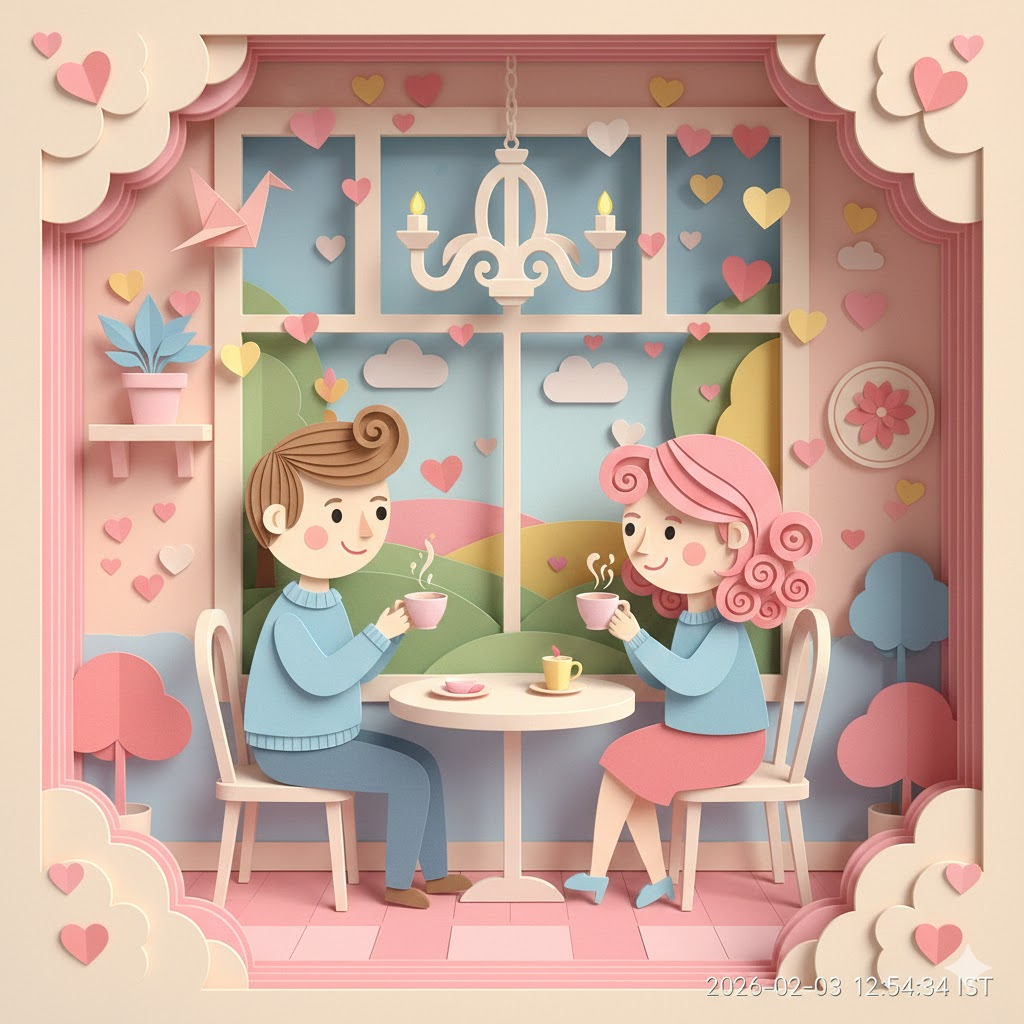 Create a children’s book-style illustration of a couple made entirely of layered paper cutouts enjoying a café date. Everything appears handcrafted from paper, with origami birds, paper flowers, and heart confetti. Soft pastel colors, visible paper textures, and layered depth. Sweet and whimsical mood. Use aspect ratio 3:4.