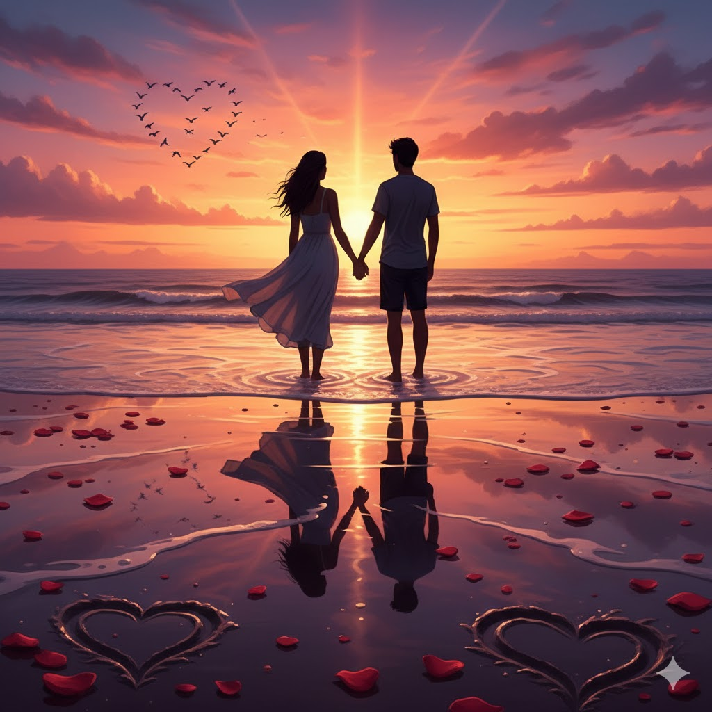 Create a romantic sunset beach illustration of a couple standing in shallow water, silhouetted against an orange, pink, and purple sky. Add heart shapes in the sand, rose petals floating on water, and birds flying in heart formations. Flowing dress details and water reflections enhance realism. Use aspect ratio 3:4.