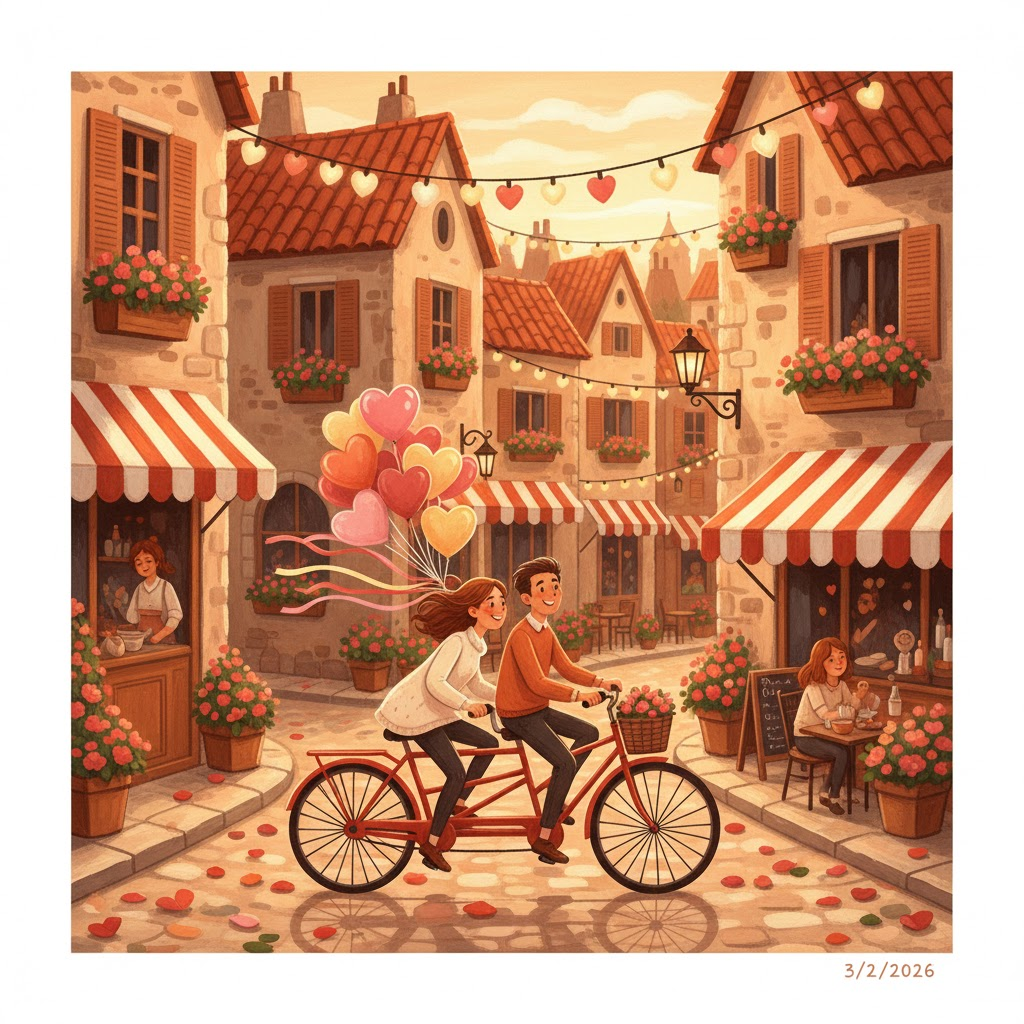 Create a whimsical gouache illustration of a couple riding a tandem bicycle decorated with heart balloons through a charming European village. Cobblestone streets, cafés, flower-filled windows, heart-shaped string lights, and rose petals on the ground. Warm terracotta and rose tones. Use aspect ratio 3:4.