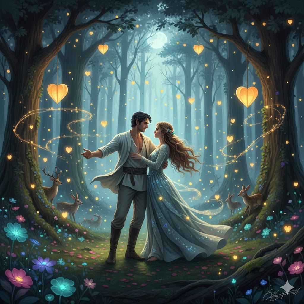Create a fantasy illustration of a couple dancing in an enchanted forest illuminated by glowing fireflies and heart-shaped lanterns. Ethereal clothing, bioluminescent flowers, mystical fog, and woodland creatures watching. Mix moonlight with warm golden lantern light. Use aspect ratio 3:4.