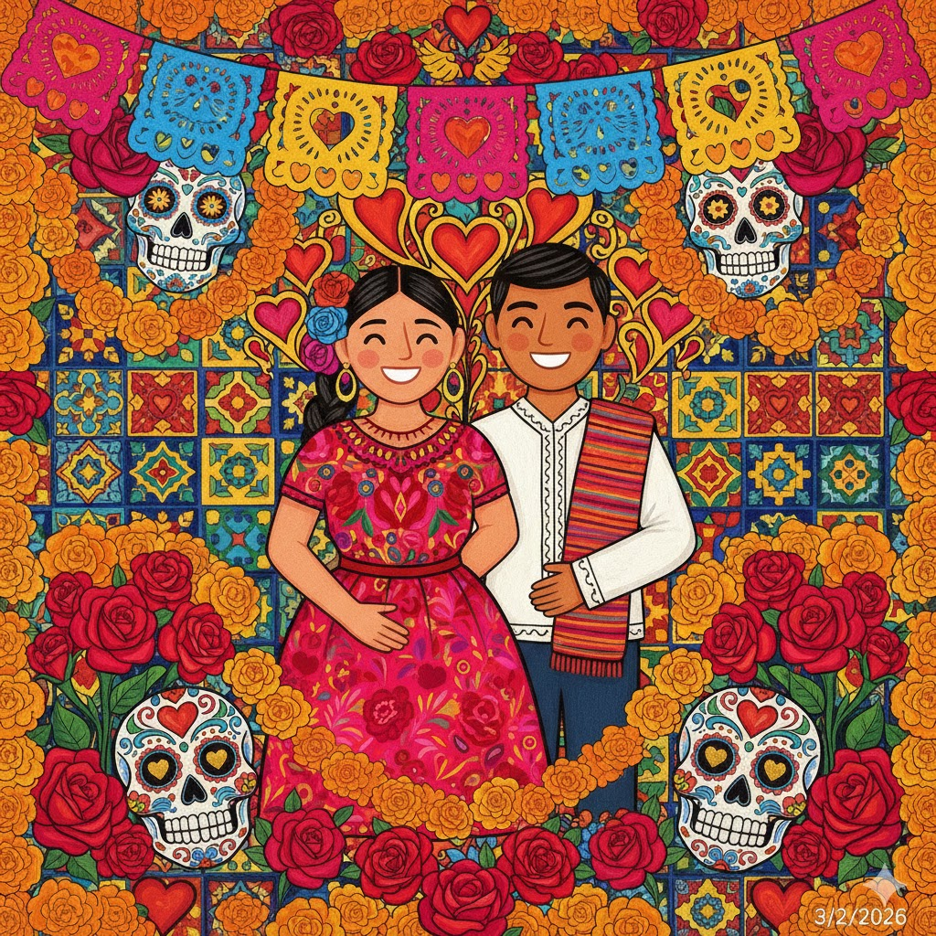 Create a vibrant Mexican folk art illustration of a couple celebrating Valentine’s Day. Include papel picado banners, marigolds, decorated sugar skulls, Talavera tiles, and traditional embroidered clothing. Use bold, saturated colors and flat decorative patterns symbolizing eternal love. Use aspect ratio 3:4.