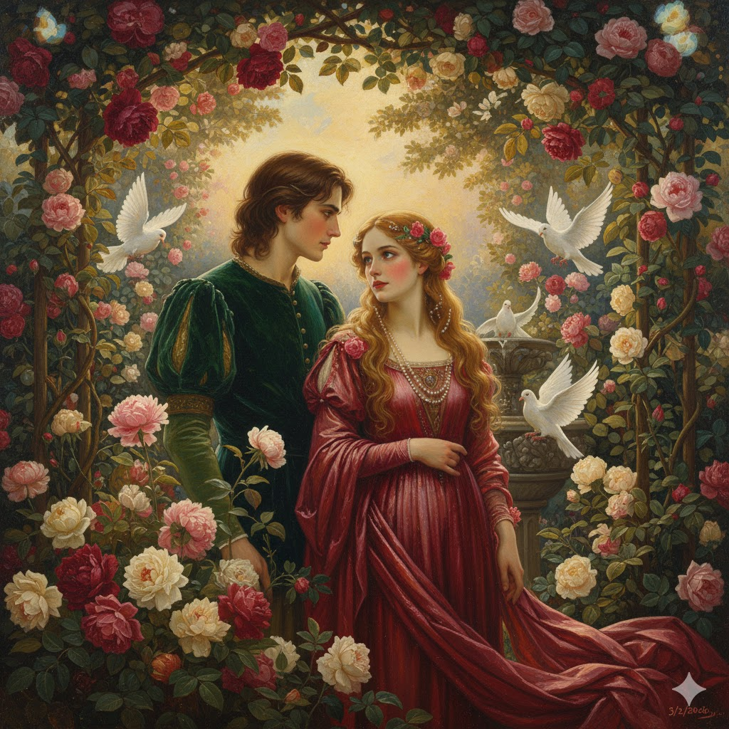 Create a Pre-Raphaelite-style oil painting of a couple in a lush garden overflowing with roses and peonies. Medieval-inspired clothing, flowing hair, dramatic lighting, and intricate botanical details. Include symbolic elements like doves and intertwined vines. Rich jewel tones. Use aspect ratio 3:4.