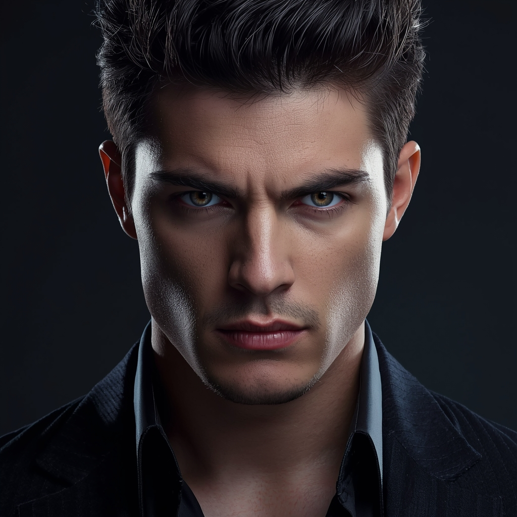 Generate a bold and confident male portrait with intense eyes, sharp jawline, cinematic lighting, dark background, stylish outfit, ultra-HD quality, professional photography style.