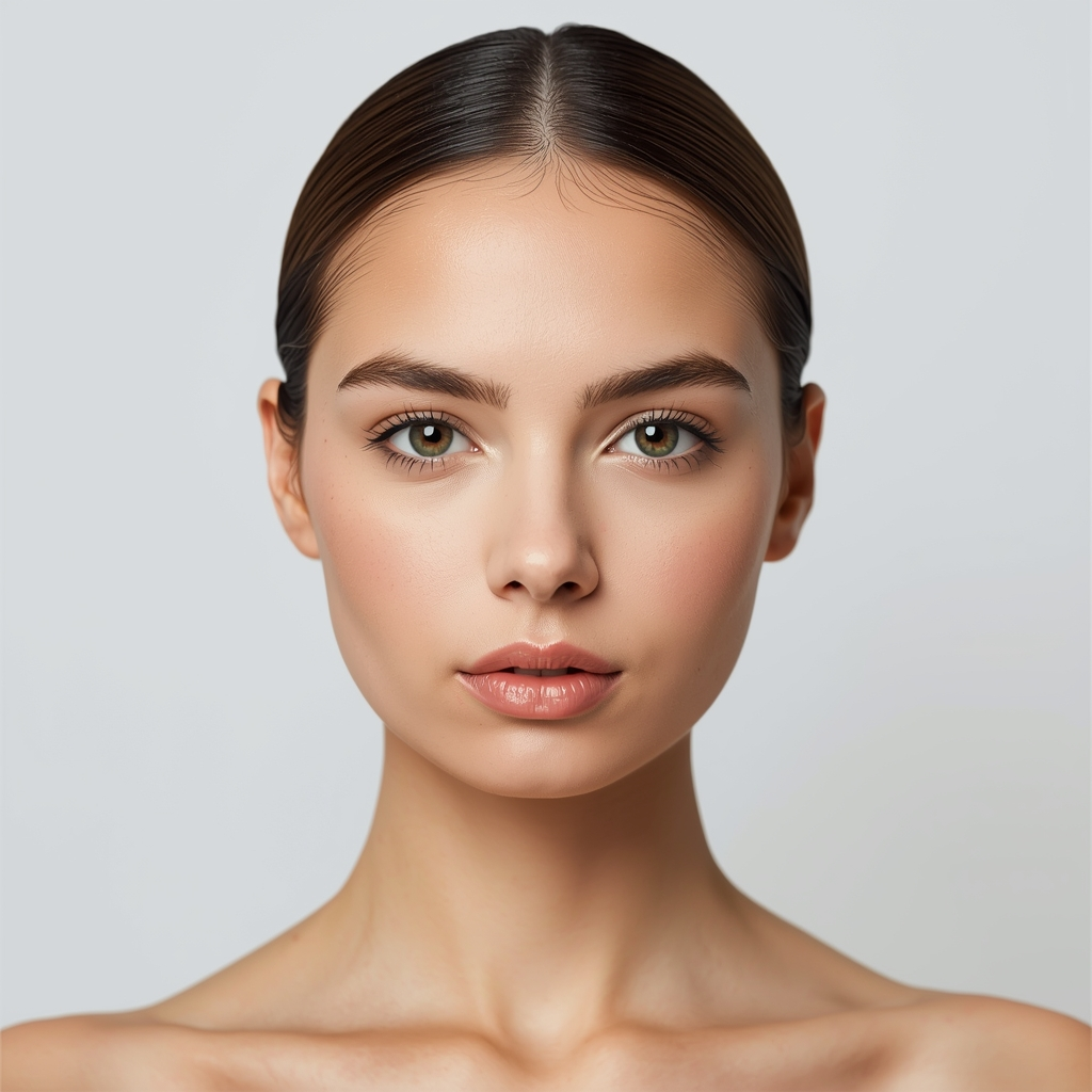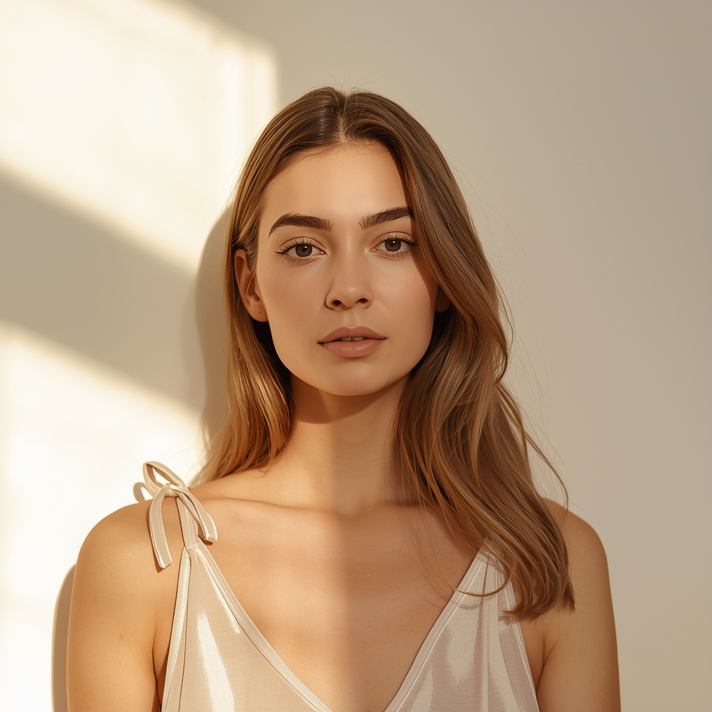 Create a clean and minimal portrait with a white or neutral background, balanced studio lighting, realistic skin details, modern aesthetic, high sharpness, professional look.