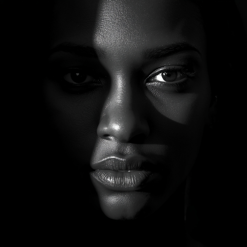 Generate an artistic black-and-white portrait with dramatic shadows, high contrast, sharp facial features, emotional depth, classic photography style, HD clarity.