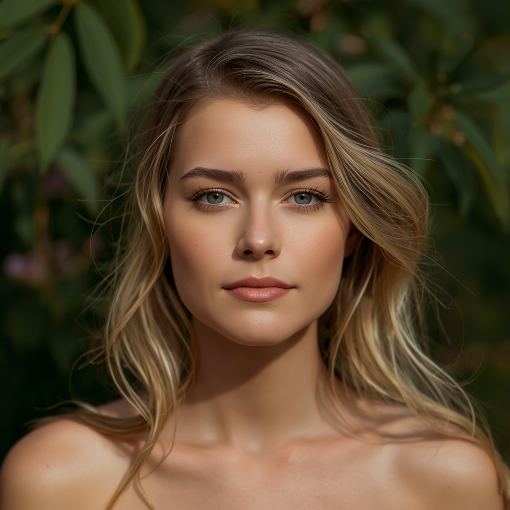 Create a natural outdoor portrait with soft daylight, greenery background, realistic color tones, calm expression, lifestyle photography feel, high-resolution aesthetic output.