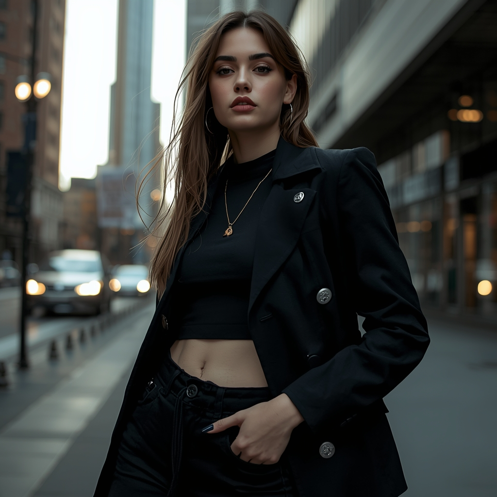 Transform the photo into a modern street-style portrait with a confident pose, urban background, sharp outfit details, moody lighting, high contrast, realistic shadows, fashion-magazine quality image.