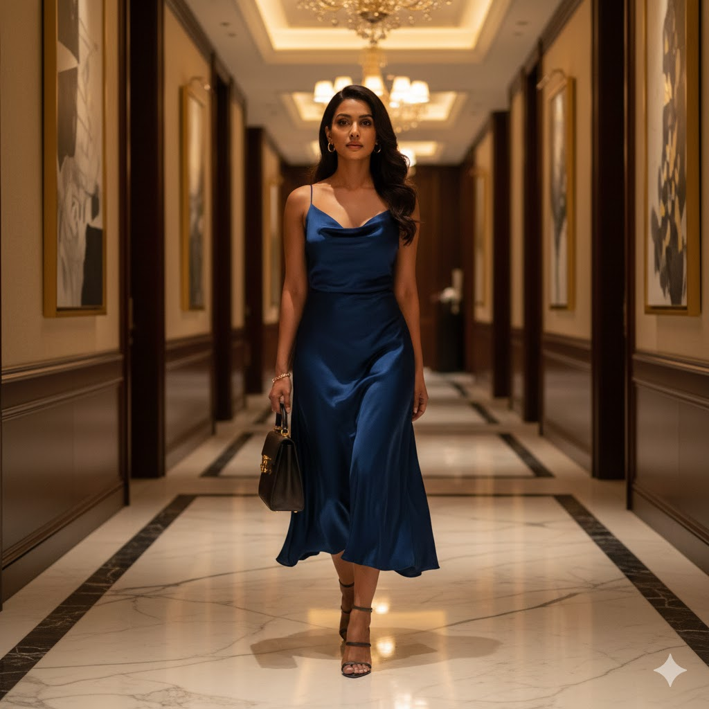 Generate an ultra-detailed 8K HD portrait of a confident Indian woman walking through a luxury hotel corridor. She wears a satin midi dress paired with elegant heels and a structured handbag. Soft golden lighting reflects off marble interiors, capturing graceful movement and a high-fashion Instagram aesthetic. [Copy]