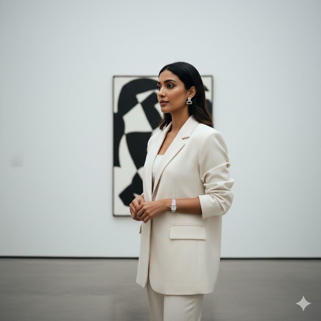 Create a cinematic 8K HD portrait of a sophisticated woman inside a modern art gallery. She is styled in a monochrome co-ord set with minimal accessories. Highlight calm facial expressions, clean white walls, soft diffused lighting, and an elite influencer-style composition. [Copy]