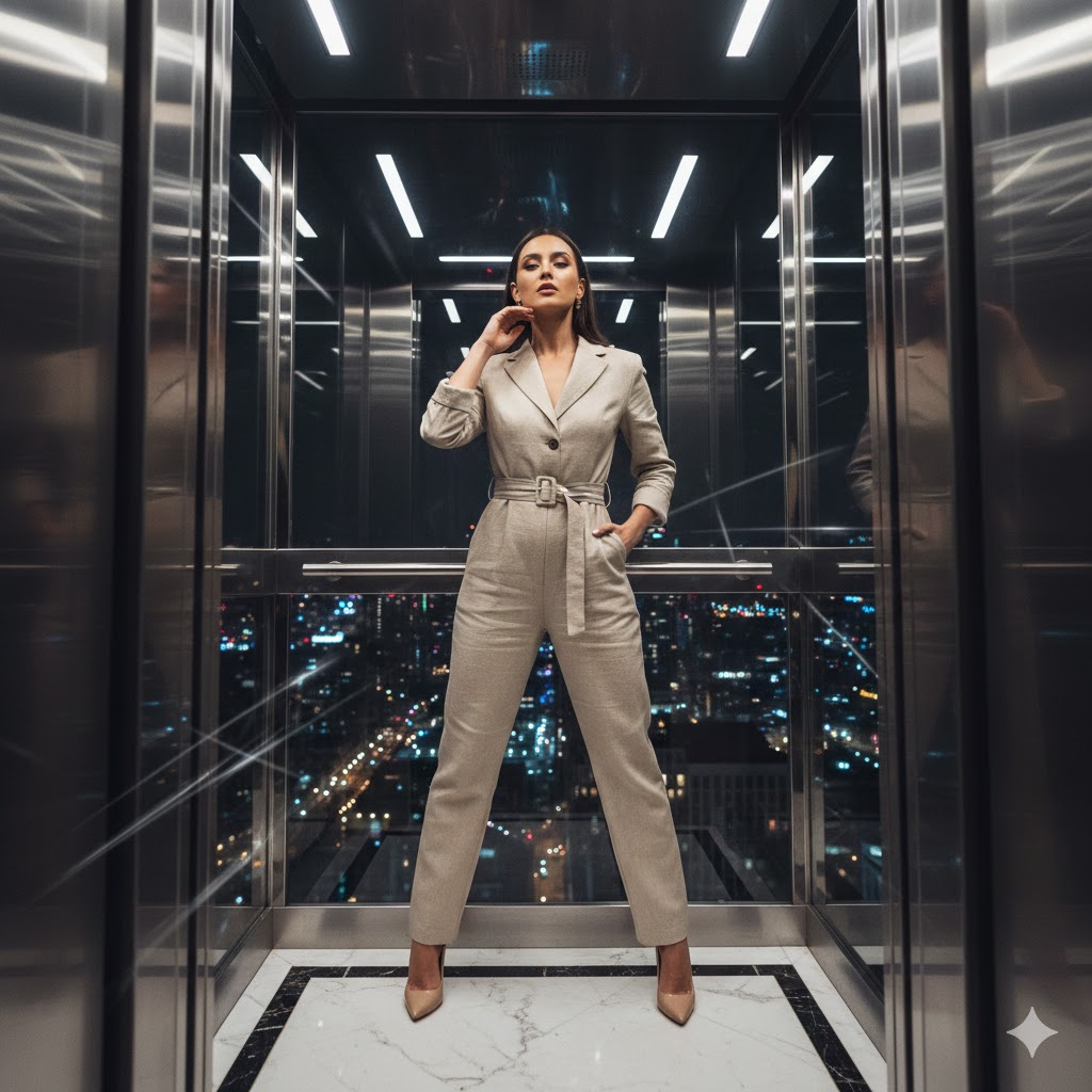 Generate a high-fashion 8K HD portrait of a woman posing confidently inside a transparent glass elevator. She is dressed in a tailored neutral jumpsuit with heels. Use reflective lighting, strong posture, and a luxury corporate Instagram reel aesthetic. [Copy]