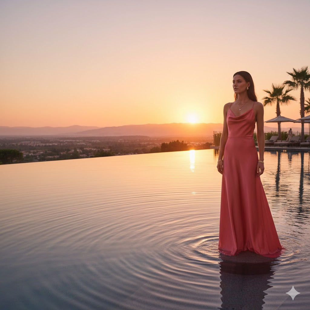 Create a cinematic 8K HD portrait of a woman standing gracefully beside an infinity pool at a luxury resort. She wears an elegant long dress with subtle jewelry. Capture warm sunset hues, gentle water reflections, and a premium vacation-inspired visual mood. [Copy]