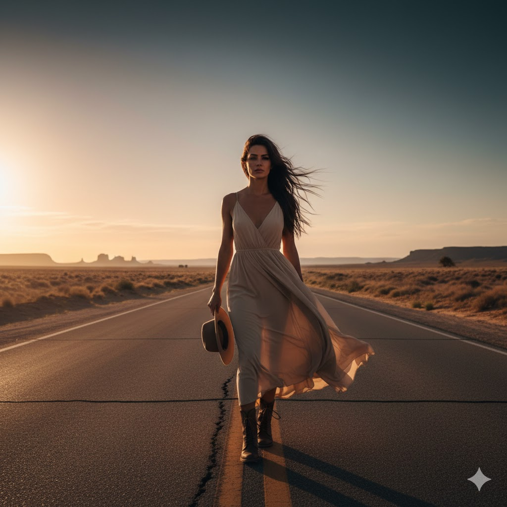 Design a realistic 8K HD portrait of a confident woman walking along an open desert road. She is styled in a neutral-toned flowing dress with boots. Include a vast sky, soft wind movement in her hair, and editorial-style cinematic fashion tones. [Copy]