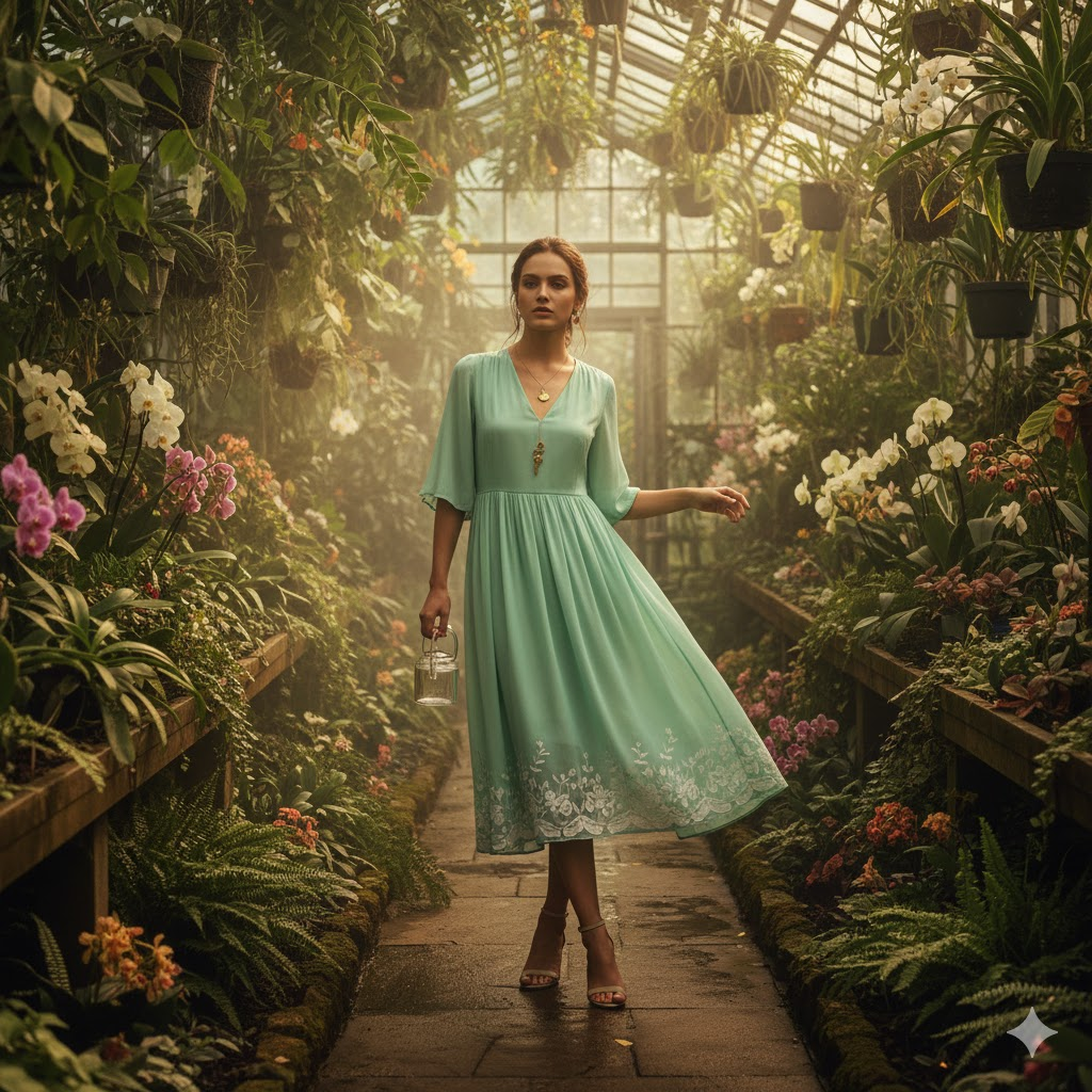 Generate a stylish 8K HD portrait of a woman inside a lush botanical greenhouse. She wears a pastel dress with delicate jewelry. Sunlight filters through green leaves, creating natural color tones and a calm, eco-elegant Instagram aesthetic. [Copy]