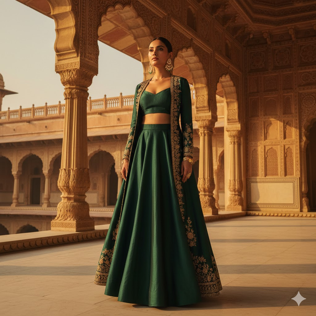 Create a cinematic 8K HD portrait of a woman standing in a grand heritage palace courtyard. She is dressed in a modern ethnic fusion outfit with statement earrings. Use warm golden lighting, regal architecture, and graceful posture for a royal yet contemporary look. [Copy]