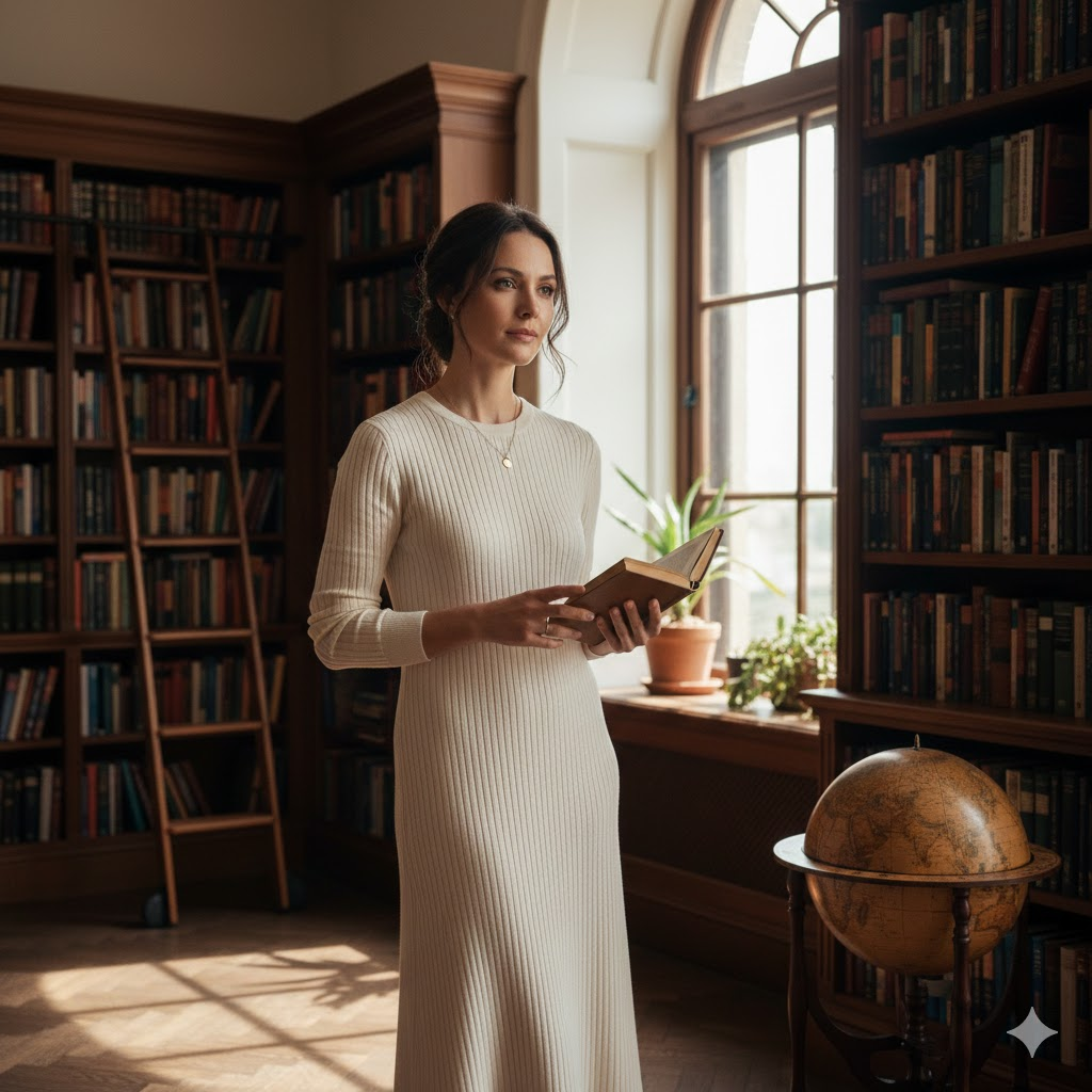 Create a refined 8K HD portrait of a woman standing near a tall window inside a private library. She is styled in a knit dress with soft makeup. Use gentle daylight, a reflective mood, and minimalist elegance for a sophisticated editorial feel.