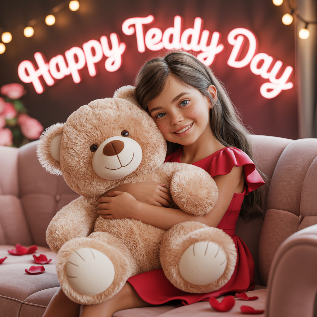 Create a hyper-realistic 8K image of a girl sitting comfortably on a soft sofa while hugging a giant fluffy light-brown teddy bear close to her chest. She is wearing a stylish red dress and smiling happily with a romantic expression. The background is warmly decorated with fairy lights and rose petals. Soft cinematic lighting highlights natural skin texture and facial details. Add glowing text behind her that reads “Happy Teddy Day” for a dreamy Valentine’s Week vibe.