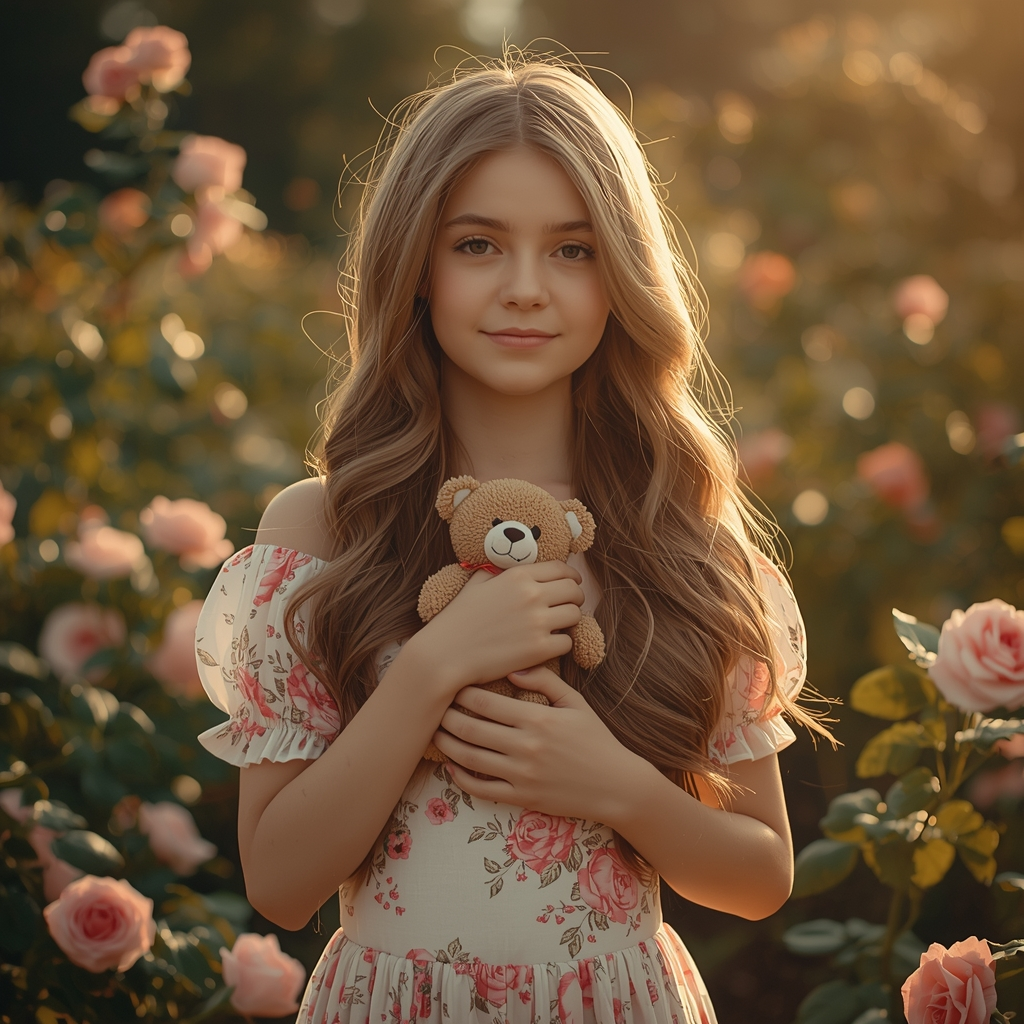 Generate a realistic image of a girl standing in a rose garden during golden hour. She is holding a small teddy bear gently near her heart and wearing a premium floral outfit. Her expression is soft and romantic. Warm sunlight touches her face, while greenery and roses appear in the background with subtle bokeh blur, creating a peaceful and elegant Teddy Day atmosphere.
