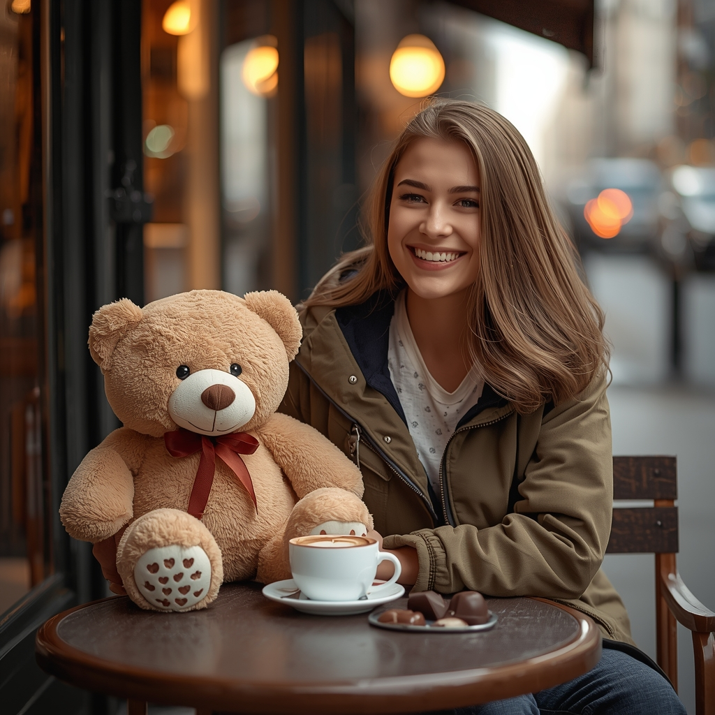 Create an ultra-realistic photo of a girl sitting at an outdoor café table with a teddy bear placed beside her. She is dressed in a trendy jacket with a casual outfit, smiling happily while looking at the teddy. Coffee cups and chocolates are on the table. The background shows a softly blurred city street with warm lights, giving the image a stylish and natural Teddy Day feel.