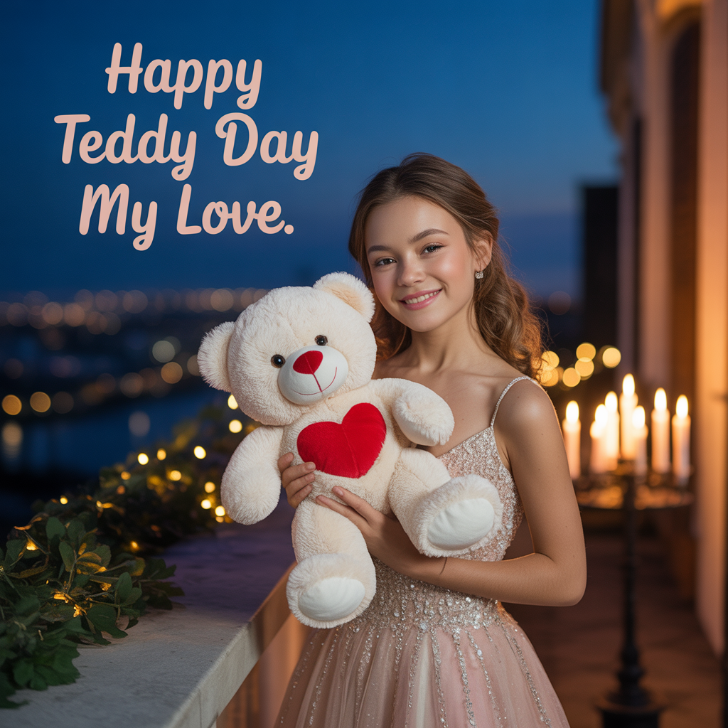 Generate a romantic nighttime image of a girl standing on a balcony under soft moonlight. She is holding a white teddy bear with a red heart and wearing a sparkling evening gown. Her expression is calm, affectionate, and joyful. City lights glow in the background, and candle lighting adds a cinematic romantic mood. She is looking into the camera. Add text in the corner: “Happy Teddy Day My Love.”