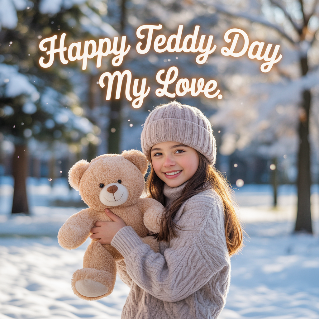 Create a realistic winter-themed image of a girl standing in a snowy park while holding a teddy bear close to her. She is wearing a cozy sweater and woolen cap, looking directly at the camera with a happy romantic smile. Soft snowflakes fall around her, with snow-covered trees and gentle sunlight in the background. Add glowing text at the top that reads “Happy Teddy Day My Love.”