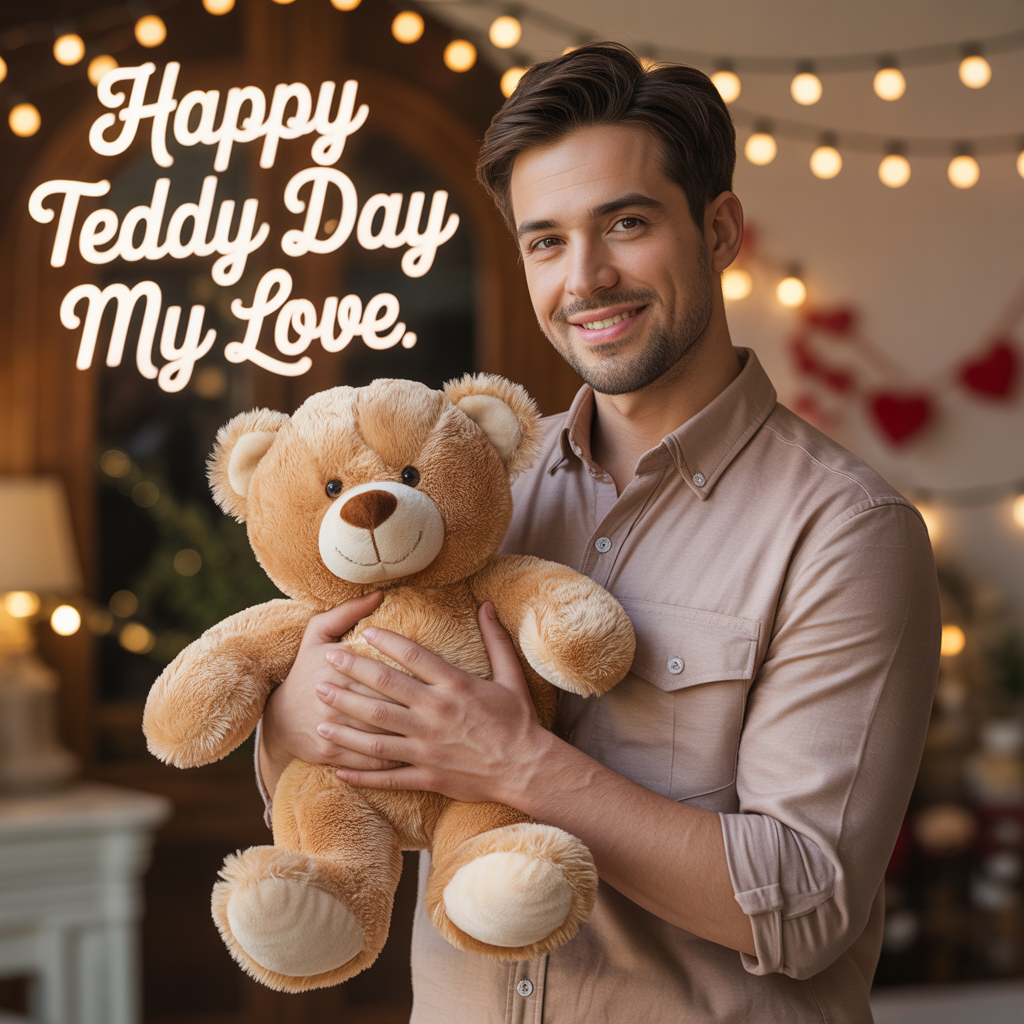 Create a high-quality realistic image of a man standing indoors while holding a soft brown teddy bear close to his chest. He is wearing a well-fitted neutral-toned shirt with rolled sleeves, giving a clean and charming appearance. He is looking into the camera with a happy and romantic expression. The background features warm decorative lights with subtle Valentine’s Week elements. Add elegant glowing text at the top: “Happy Teddy Day My Love.”