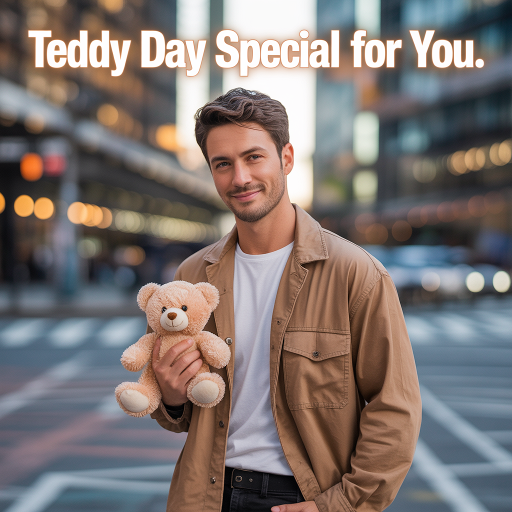 Create an ultra-realistic outdoor image of a man standing in a stylish urban location during golden hour. He is holding a small teddy bear in one hand while the other rests casually in his pocket. He is wearing a trendy casual outfit that fits naturally. He faces the camera with a confident and soft smile. Add glowing text at the top saying “Teddy Day Special For You.”