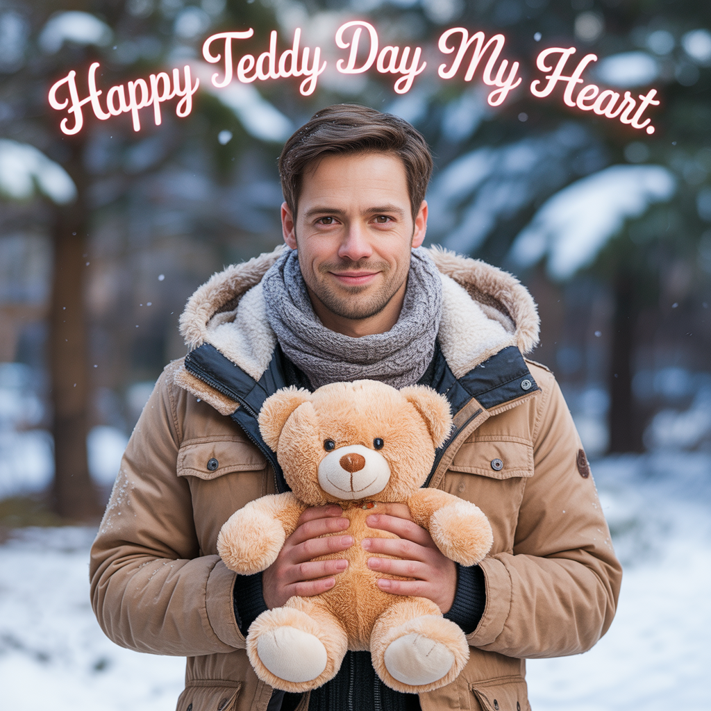 Create a realistic winter-themed image of a man standing in a snowy environment while gently holding a teddy bear. He is wearing a cozy winter jacket with a scarf and looking directly at the camera with a loving, calm expression. Soft snowflakes fall around him. Add romantic glowing text at the top that reads “Happy Teddy Day My Heart.” He should be smiling naturally
