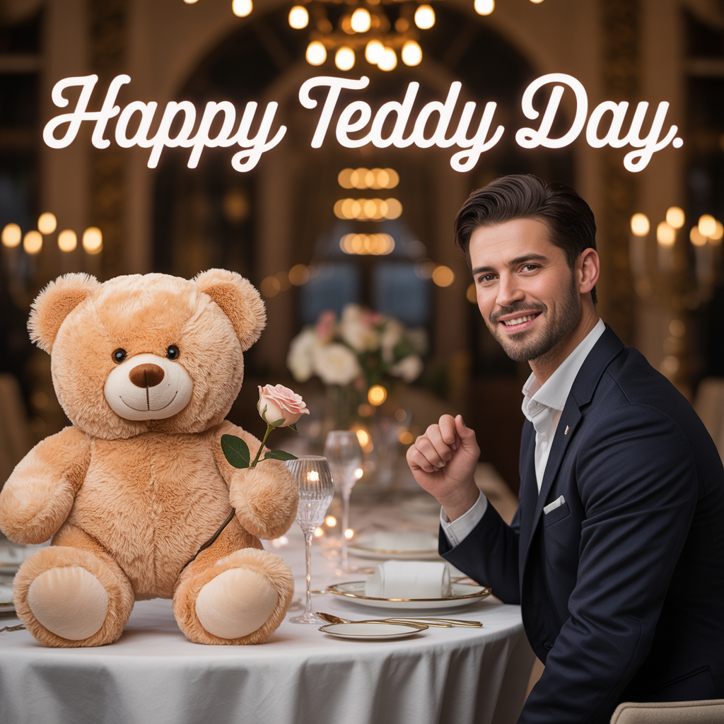 Create an ultra-realistic image of a man sitting at a decorated dinner table in a luxury romantic setting. A teddy bear holding a small rose is placed beside him. He is wearing a classy outfit suitable for a romantic evening. He is facing the camera with a warm and happy expression. Add stylish glowing text at the top that reads “Happy Teddy Day.” The image should look premium, romantic, and naturally edited.