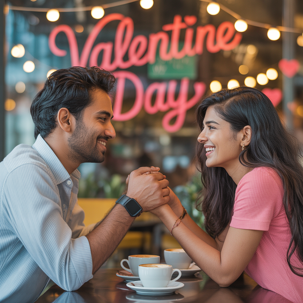 A 25-year-old Indian couple sitting in a cozy café, holding hands across the table, coffee cups visible, warm indoor lighting, candid realistic expressions. On the wall behind them written “Valentine Day”, soft bokeh lights, ultra-realistic, iPhone-style photography, high detail, romantic aesthetic.
