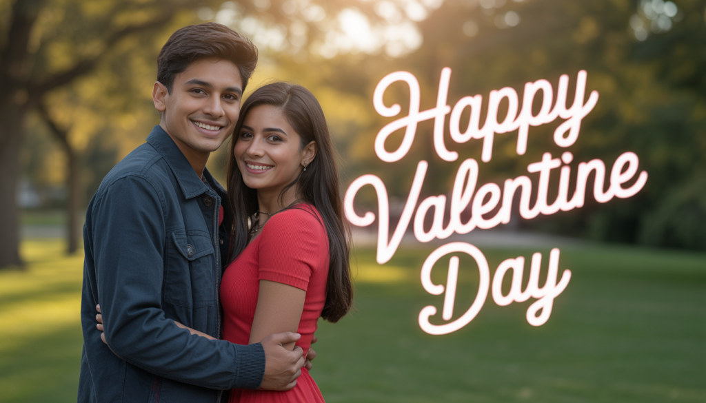 An ultra-realistic photo of a 25-year-old Indian boy and girl standing close together in a beautiful park, soft sunset lighting. The boy is wearing a casual jacket, the girl is wearing a red dress, both smiling naturally. In the background, stylish glowing text “Happy Valentine Day”, cinematic depth of field, DSLR look, realistic shadows, romantic mood, 4K quality.