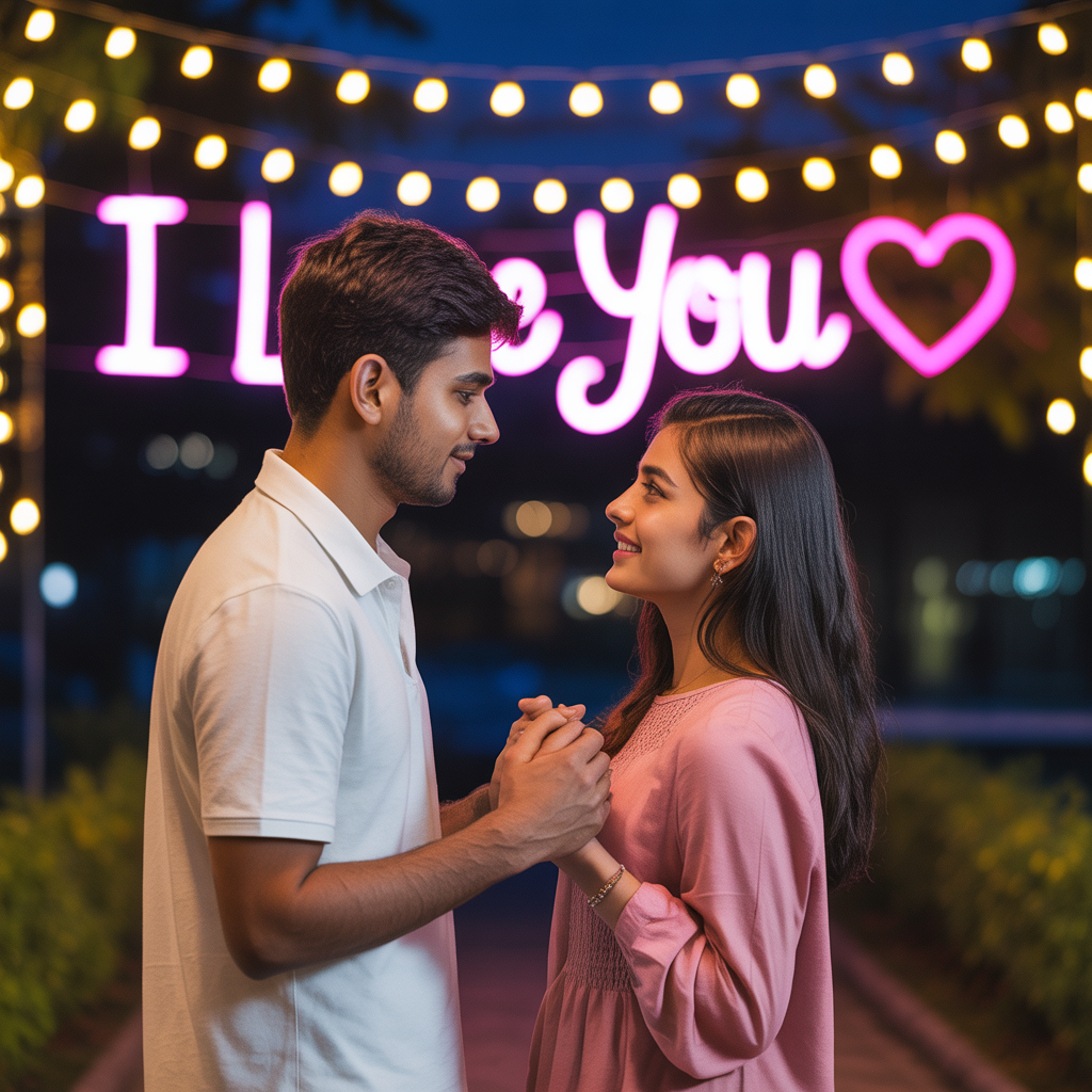 A realistic portrait of a young Indian couple (25 years old) standing under fairy lights at night. The boy gently holds the girl’s hand with emotional eye contact. Neon glowing text “I Love You ❤️” behind them, Valentine Day theme, cinematic lighting, ultra HD, natural skin tones.