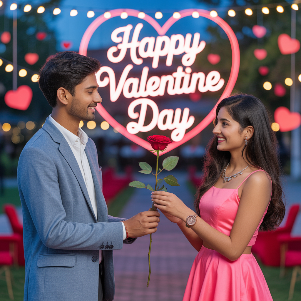 A 25-year-old Indian boy giving a red rose to a smiling girl, both wearing stylish outfits in an outdoor evening Valentine setup. Floating heart lights and glowing text “Happy Valentine Day”, ultra-realistic photography, shallow depth of field, professional camera quality.