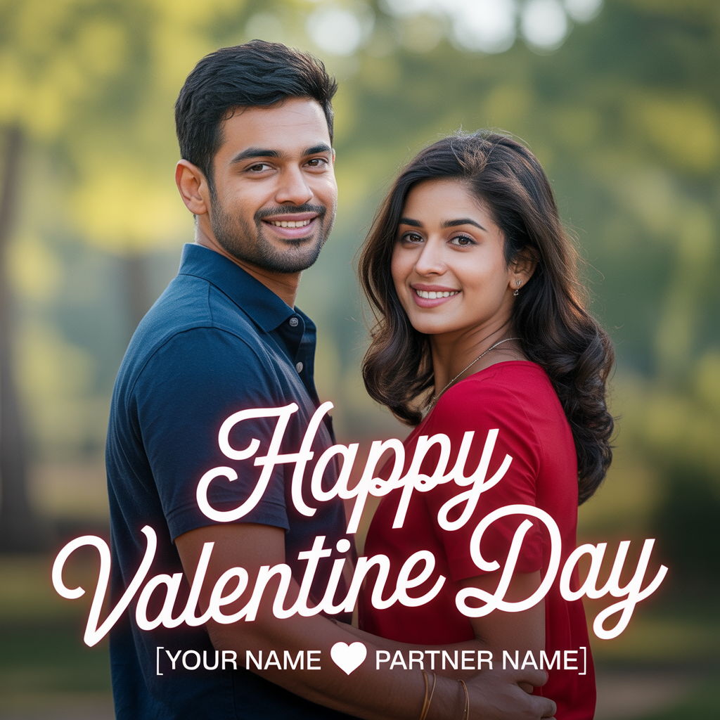 A romantic realistic photo of a 25-year-old Indian couple standing side by side in soft daylight with gentle smiles. Behind them elegant glowing text “Happy Valentine Day – [Your Name ❤️ Partner Name]”, premium cinematic look, natural colors, high-quality realism.