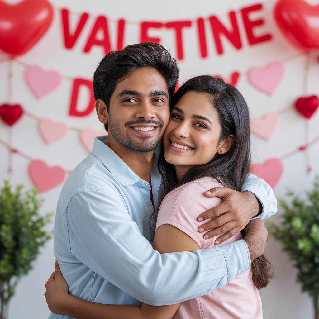 An ultra-realistic image of a 25-year-old Indian boy hugging his girlfriend from behind, both looking happy and relaxed. Valentine Day decorations with balloons and hearts, background text “Valentine Day”, soft pastel tones, DSLR photography, romantic mood.