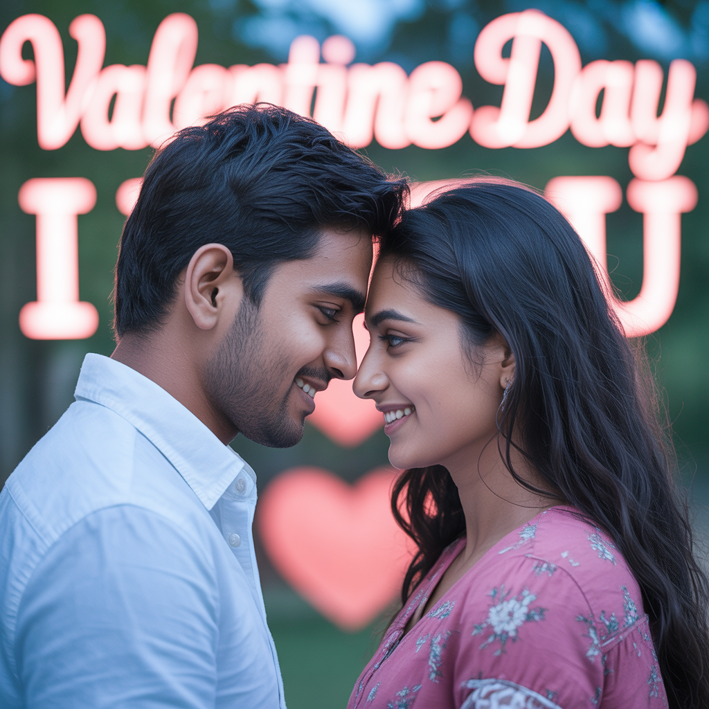 A realistic close-up portrait of a young Indian couple (25 years old), faces close together with soft smiles. Background blurred with glowing text “Valentine Day” and “I Love U”, dreamy lighting, high resolution, professional photography style.