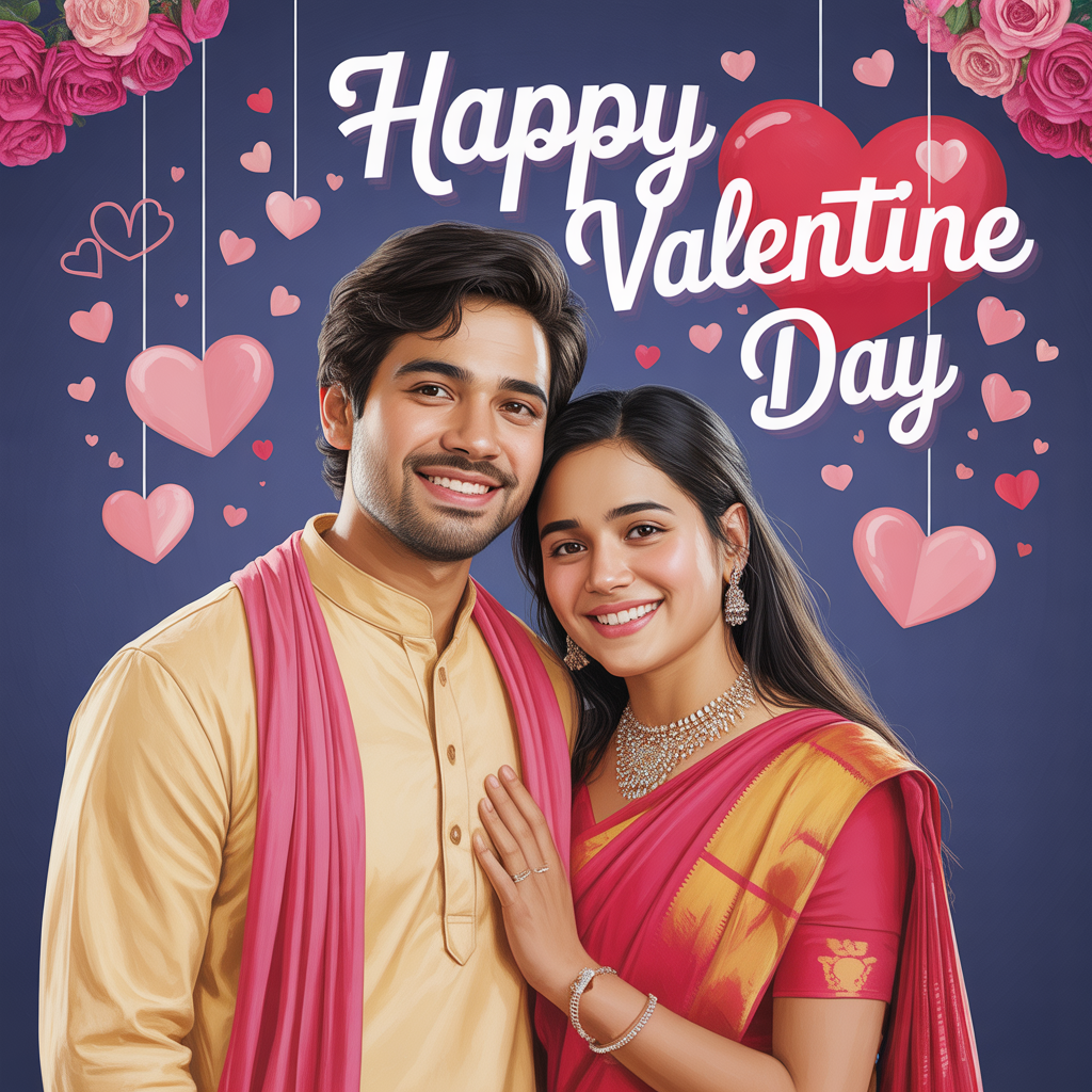 A 25-year-old Indian boy wearing a kurta and a girl wearing a saree, standing together with romantic expressions. Festive Valentine theme with decorative hearts and text “Happy Valentine Day”, ultra-realistic, rich colors, sharp details, cultural romantic vibe.