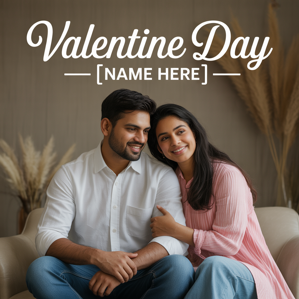 A clean, aesthetic Valentine Day image of a 25-year-old Indian couple sitting peacefully together, neutral background, soft lighting. Minimal stylish text “Valentine Day – [Name Here]”, realistic photography, premium high-quality look.