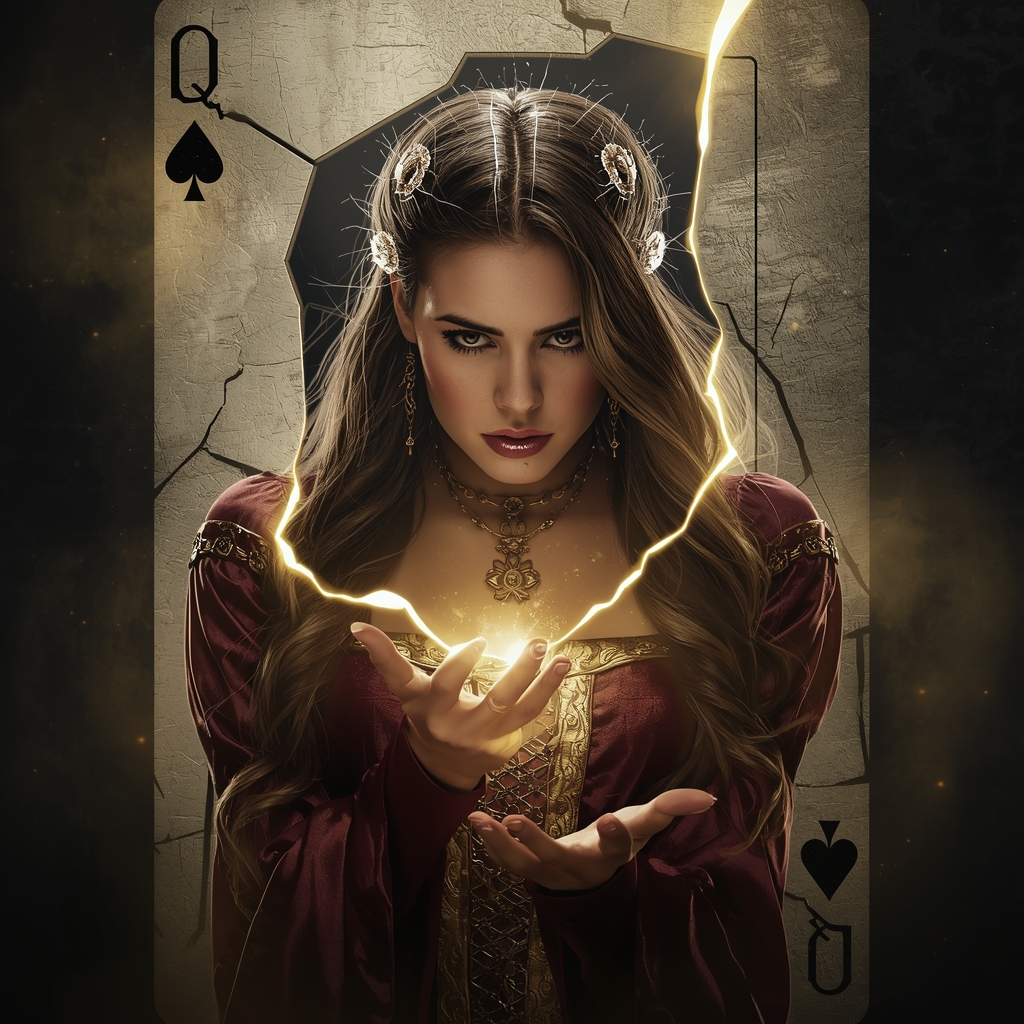 Hyper-realistic cinematic fantasy poster using the same face and identity. A powerful female sorcerer breaking through a cracked Queen of Spades card, glowing golden magic, royal maroon-gold medieval outfit, dramatic lighting, floating dust, dark fantasy background, sharp 8K realism.