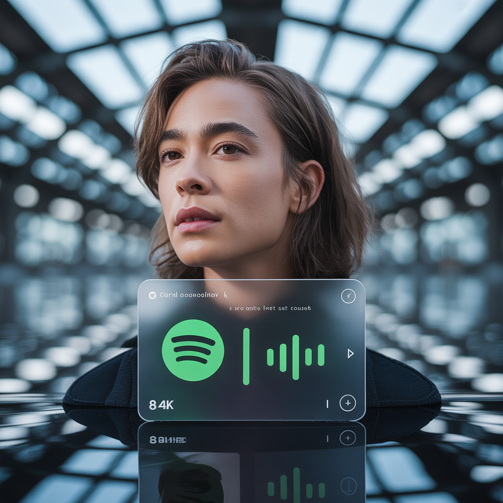 Cinematic AR-style portrait with floating Spotify-style music cards, frosted glass UI, glowing outlines, immersive depth, cool neutral tones, shallow depth of field, futuristic editorial lighting, ultra-realistic 8K output.