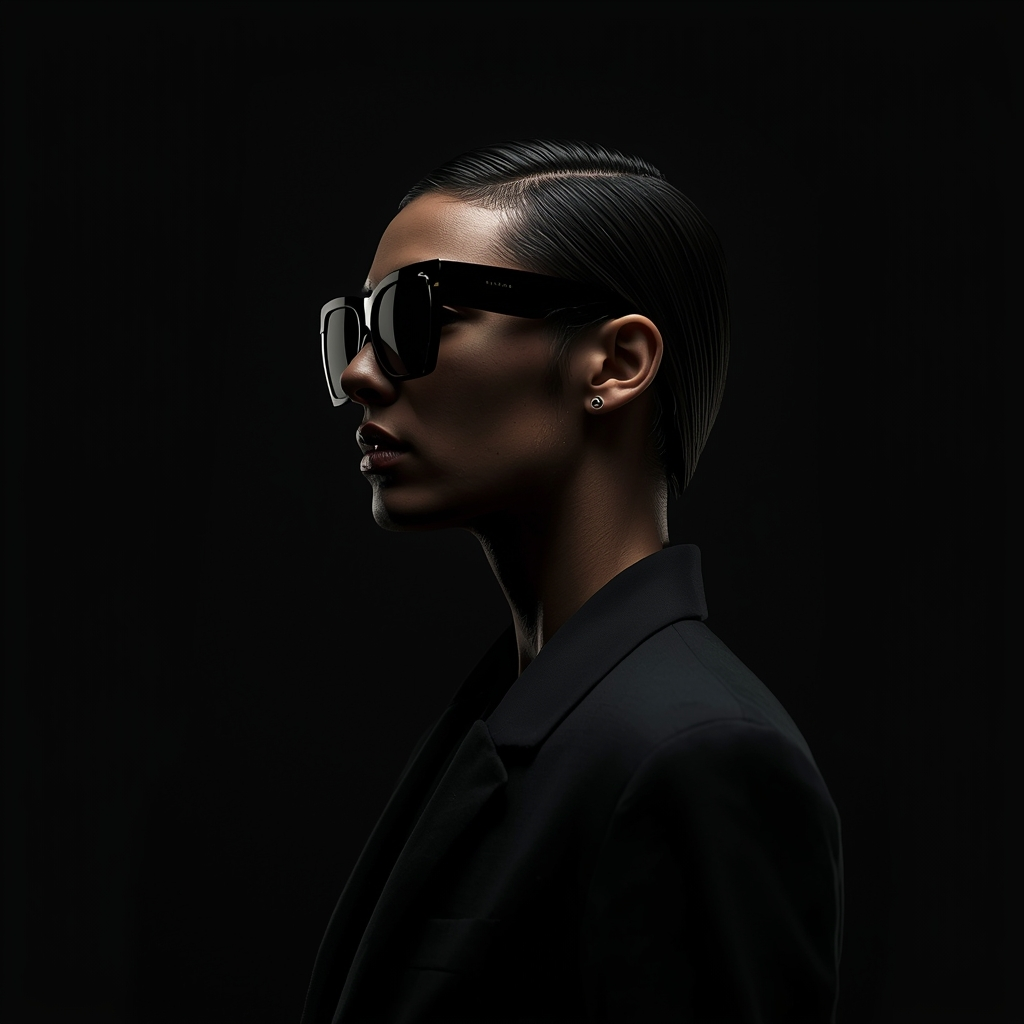 Minimalist high-fashion portrait, dark background, strong rim lighting outlining hair and jawline, structured blazer, sleek sunglasses, extreme contrast, sculptural silhouette, luxury editorial style, 8K realism.