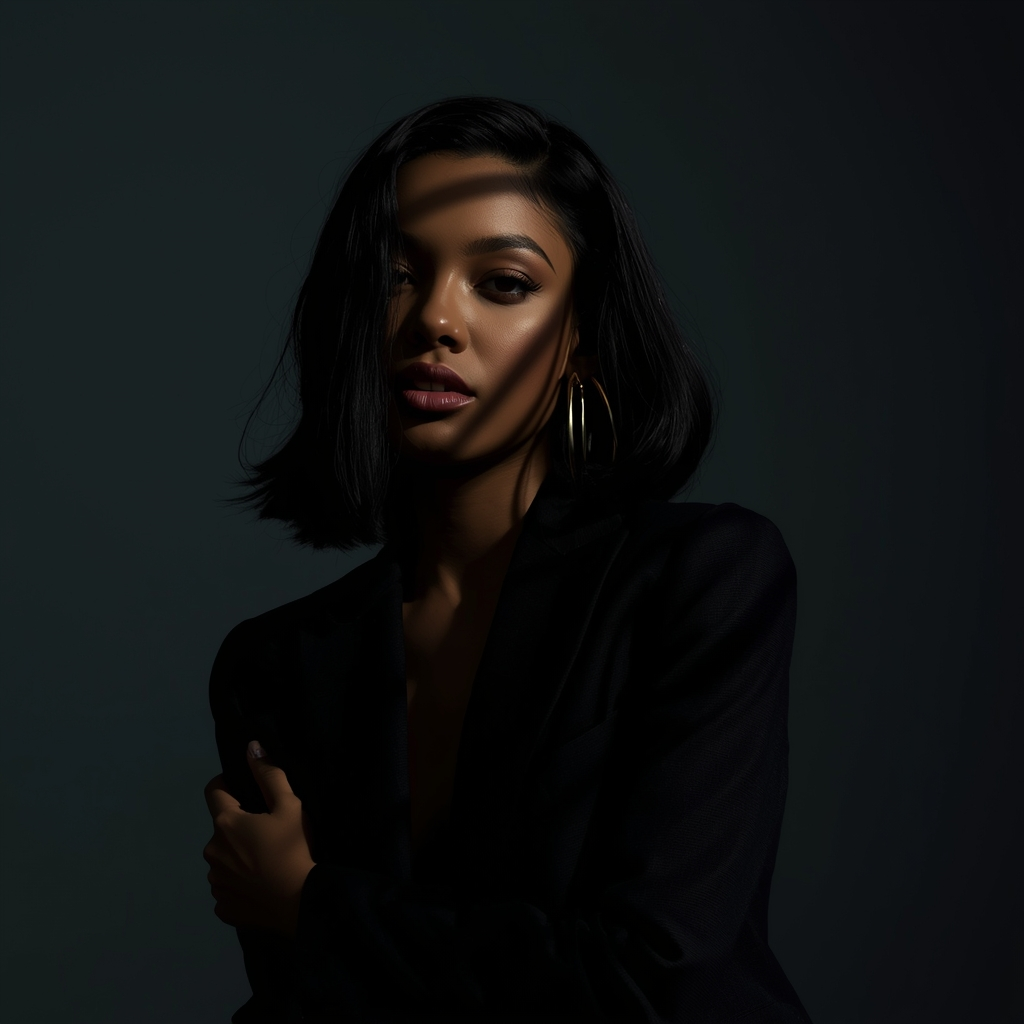 Moody low-light fashion portrait, controlled shadows, cinematic lighting, neutral background, elegant posture, luxury editorial aesthetic, high-contrast 8K realism.