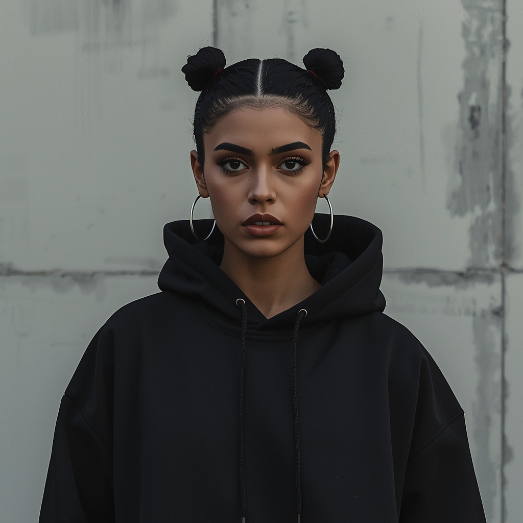 Hyper-realistic urban portrait, iPhone-style direct flash, neutral concrete background, streetwear outfit, confident posture, matte makeup, modern editorial vibe, 8K vertical frame.